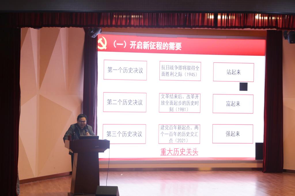 报告会上,杨建中围绕《习近平总书记关于<中共中央关于党的百年奋斗重大成就和历史经验的决议>的说明》和《中共中央关于党的百年奋斗重大成就和历史经验的决议》进行了具体宣讲。杨建中立足党的百年历史,从《决议》的时代背景、百年主题与四大成就、三次飞跃与两个确立以及历史意义和基本经验四个角度出发,深刻分析了十九届六中全会的划时代意义。他结合时代背景,向与会成员具体解读了此《决议》同党的历史上前两份《决议》的不同之处。他提出:《决议》重点强调十八大以来,在以习近平同志为核心的党中央坚强领导下党和国家各项事业取得的历史性成就和根本性变革;指出了党“是什么”“干什么”以及建党以来党的宝贵历史经验。杨建中以新时代中国特色社会主义的伟大成就为切入点,讲述了提出“四个自信”“两个维护”“五位一体”建设等原创性的治国理政新思想新理念的底层逻辑。他强调:十八大以来,党勇于进行自我革命,这是重塑党风政风,加强党的建设,提高党的长期执政能力建设和党的先进性、纯洁性的强大动力;“两个确立”是进一步统一全党思想和认识的理论武器,具备在推进中华民族伟大复兴进程中坚定信念、凝聚力量的决定性意义。他指出:《决议》明确了习近平新时代中国特色社会主义思想是马克思主义中国化成果的第三次飞跃,充分体现党深刻把握历史发展规律、始终掌握党和国家事业发展的历史主动和使命担当;总结了百年党史中的十条宝贵历史经验,对实现中华民族伟大复兴和全面建设社会主义现代化强国具有强烈的指导意义。
