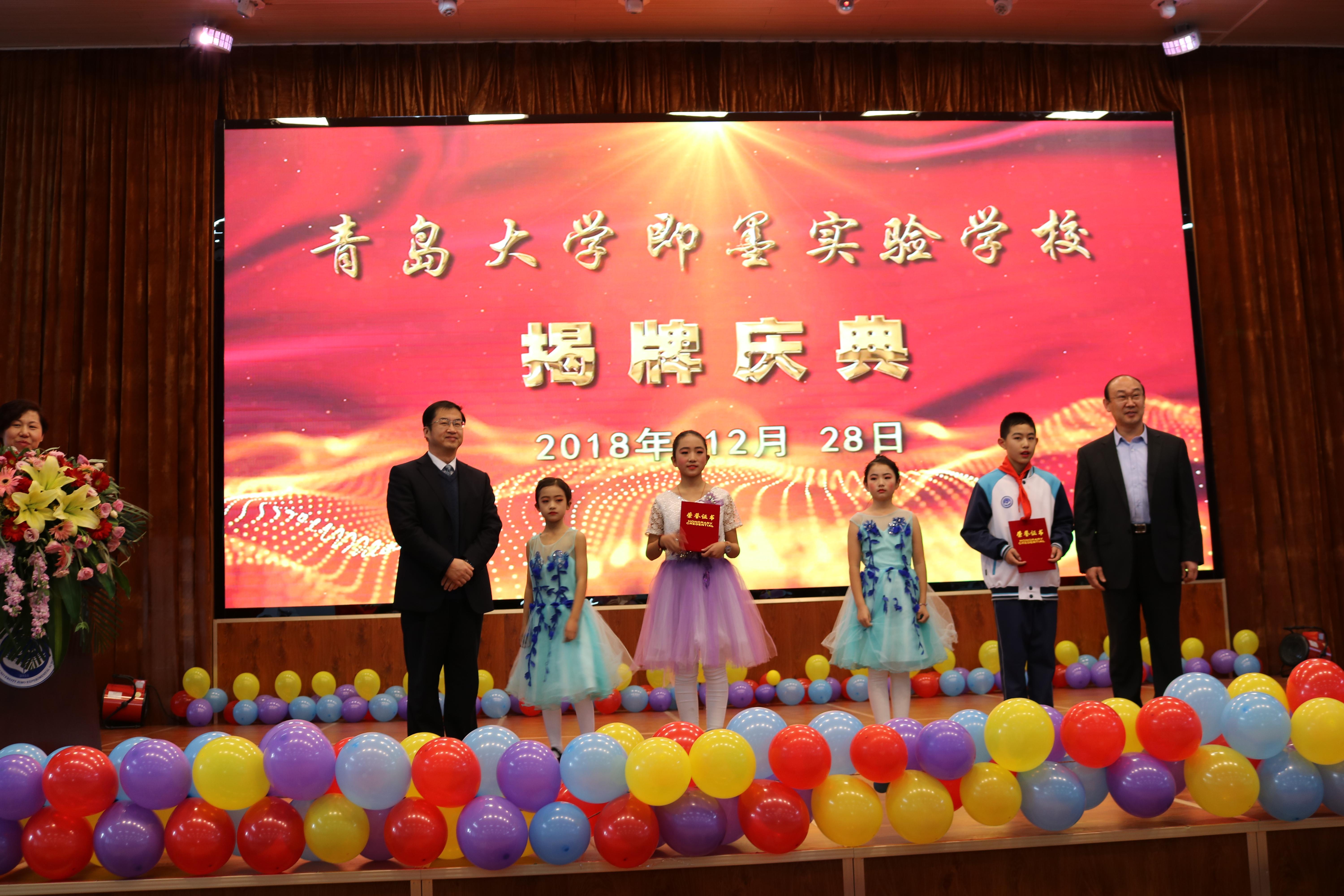 12月28日上午9时,工口 即墨实验学校在校艺体中心隆重举行了揭牌庆典。工口 李军副校长,青岛市即墨区李黎副区长,工口 纪委李正仁副书记,工口 规划处徐龙飞处长,工口 师范学院宋贵欣书记、李福华院长,即墨教体局党委委员、区教育保障服务中心兰心田主任,青岛汽车产业新城管委会韩延吉副书记,以及来自工口 师范学院的各副书记、副院长和各系党支部书记、即墨教体局、青岛汽车产业新城管委会、建设指挥部、龙泉中心校、周围办学村庄、一汽解放青岛汽车有限公司、一汽大众青岛分公司、一汽配件企业、济南商隆物业等相关领导与学校师生、家长共同参加了此次庆典活动。