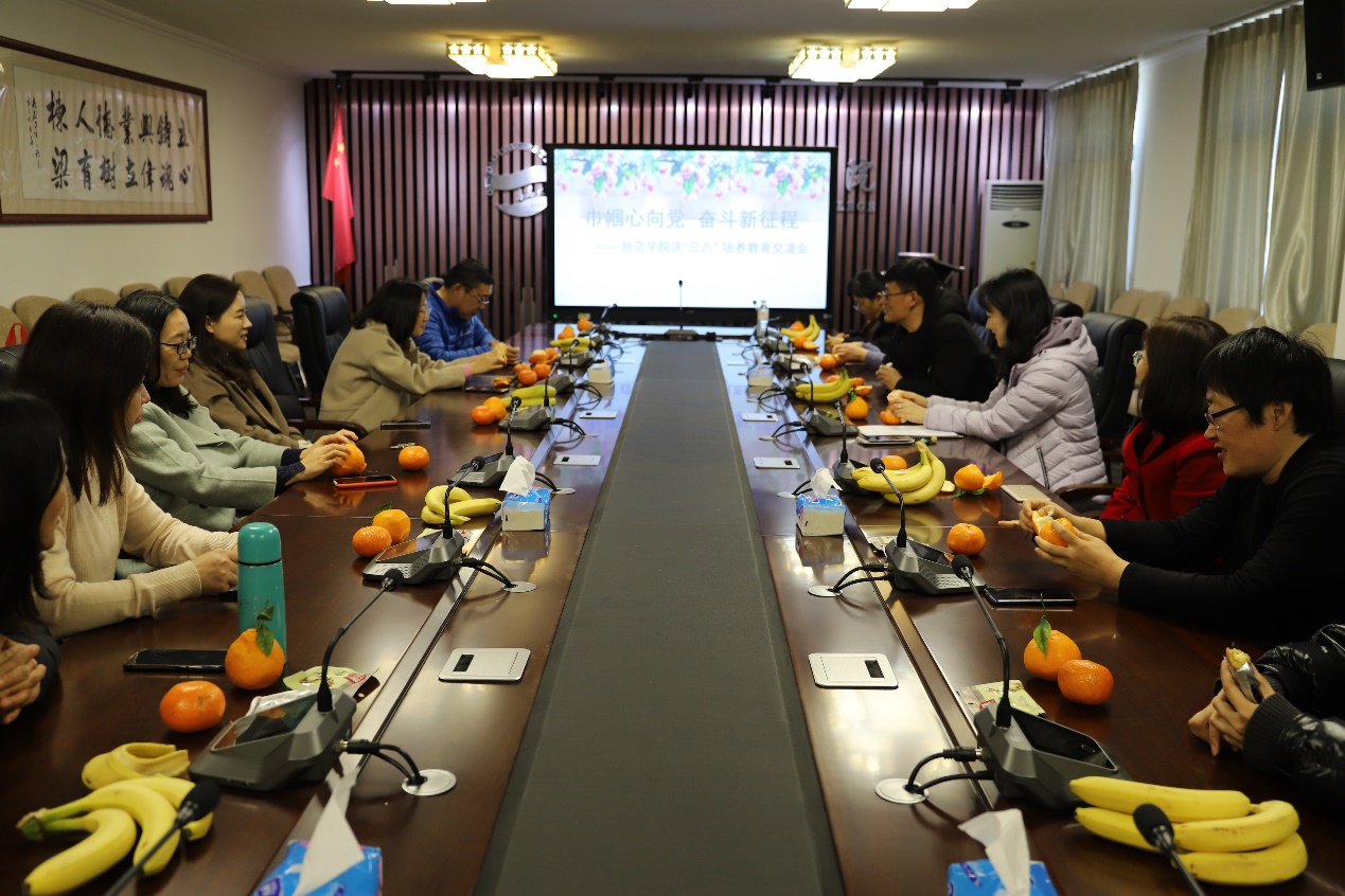3月9日下午,师范学院在德润楼301会议室召开“巾帼心向党 奋斗新征程”女职工培养教育座谈会。邀请心理系陈兴华老师做《做孩子成长的陪伴者》专题交流。座谈会由党政办王初主持。学院副院长刘启民、部分教工参加了交流会。