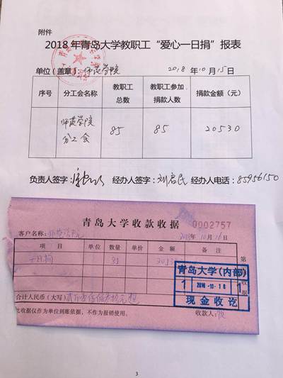根据校工会在在全校教职工中开展“爱心一日捐”活动的通知精神,在学院党委的领导下,学院工会以以“扶危济困,兴善助学”为主题,积极对捐赠活动进行宣传,制定具体实施方案,依靠各工会小组,积极对捐赠活动进行宣传,形成“人人关心慈善、人人支持慈善、人人参与慈善”的良好氛围。活动中,全院85位教职工自愿参与,奉献爱心,共捐款20530元。