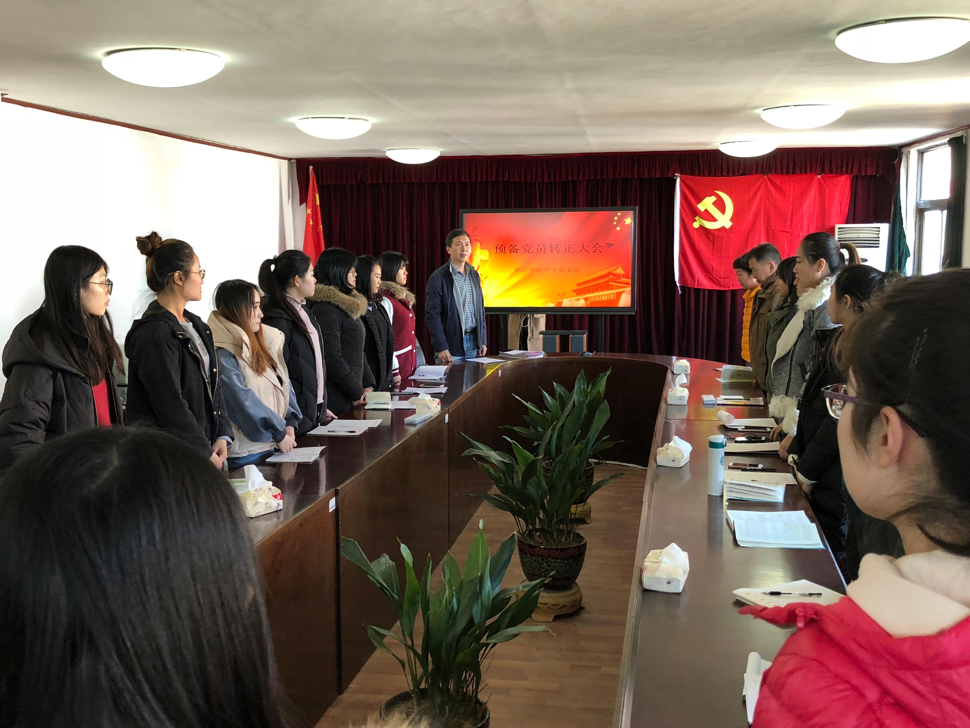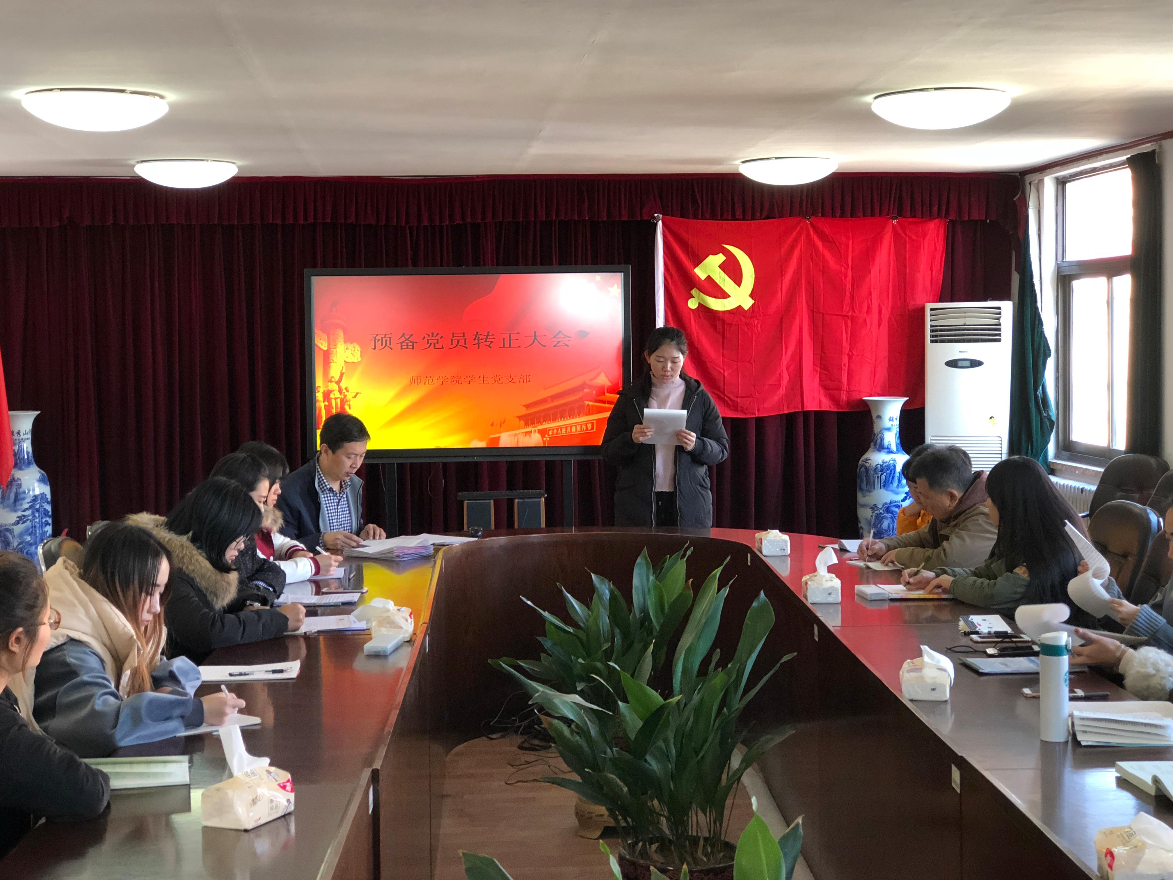 2017年11月24日13:00,师范学院学生党支部全体成员在德润楼301会议室召开了预备党员转正大会,会议讨论了薛悦、姜晓、赵珊、王辉、林海倩、刘快6名同志的转正申请,大会一致同意薛悦等6名同志按期转为中共正式党员。