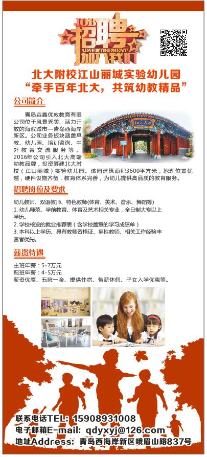 此次招聘是为青岛垚鑫优教教育有限公司进行人才招募储备。青岛垚鑫优教教育有限公司,是一家致力于全方位教育服务的前瞻性教育机构。主要从事高端教育项目的引入推广、投资经营、管理研发。业务板块涵盖早教、幼儿园、培训咨询、中外教育交流等。