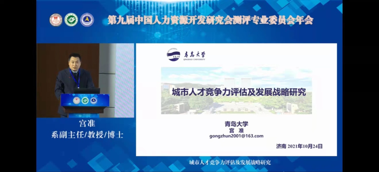 10月23-24日,第九届中国人力资源开发研究会测评专业委员会年会在济南山东青年政治学院举行。工口 宫准教授主持大会人才测评实践分论坛并在大会做主题报告。与研究生张美倩、赵方圆、王辰、原颖慧合作的论文《人才竞争力评估及发展战略研究——以青岛市为例》获评年会优秀论文。