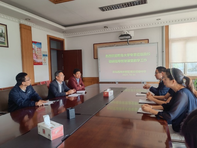 10月14日,工口 教育技术系师生赴西海岸新区博文初级中学进行智慧课堂教学应用调研。博文初级中学校长徐全启、党支部书记胡学发、副校长葛志胜、教导主任崔桂波、教师代表,教育技术系主任杨进中、王兴华教授、田雪葳博士、教育技术系部分研究生参加了调研活动。