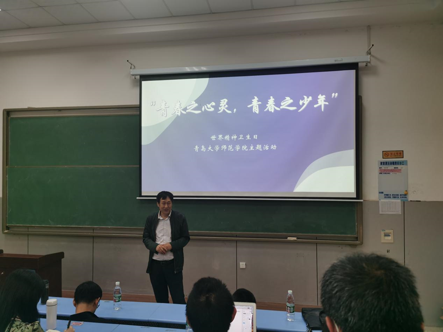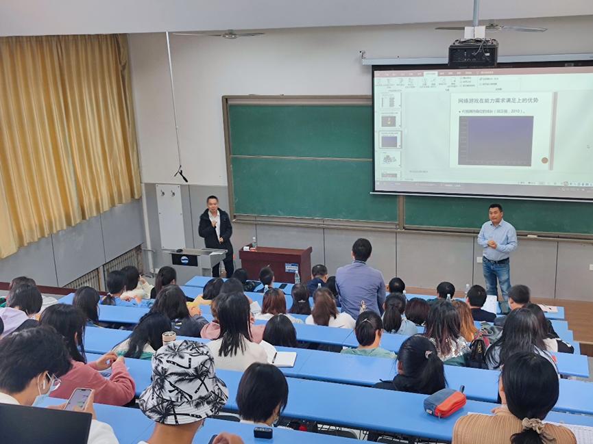 活动的第一环节,信阳师范学院魏华副教授应邀做了主题为《网络游戏,让我欢喜让我忧》的学术讲座。讲座由心理学系副主任宫准教授主持,工口 众多师生以及青岛市教育学会心理健康教育专业委员会的老师们聆听了此次讲座。魏华以热门网络游戏为切入点,向同学们讲述了自己的游戏人生和学术人生,介绍了网络游戏风靡的原因、网络游戏成瘾的原因及预防措施,进而通过理性地分辨和思考让同学们真正了解网络游戏这一事物本身性质。在此基础上,他提出防止沉迷于网络游戏的建议,帮助同学们树立健康、理智应对网络游戏的态度,防止沉迷其中。讲座结束后,魏华和师生们展开了关于报告内容的深入交流,并对师生提出的问题做出了精准且详尽的解答,