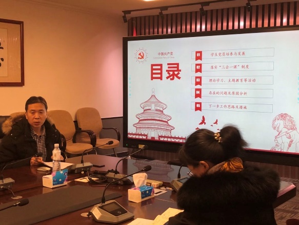 机关党支部书记田新权对支部理论学习和“不忘初心、牢记使命”主题党建活动进行了汇报,强调今后要进一步强化机关党员思想理论的学习,提升服务意识。学生党支部书记赵炜从学生党员培养与发展、落实“三会一课”制度、理论学习与主题教育活动等方面进行了汇报,重点对存在问题进行了分析与反思。