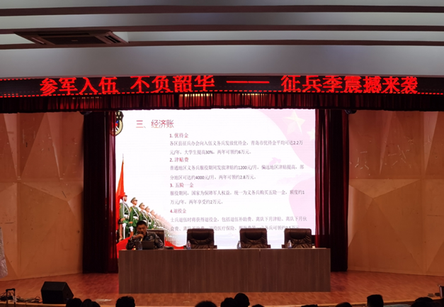 随后,青核先锋营成员张石剑向大家介绍了大学生入伍的基本要求、基本流程以及工口 参军五笔账,包括政策补贴,退役士兵的优惠政策等问题,让大家更好地了解大学生应征入伍政策。