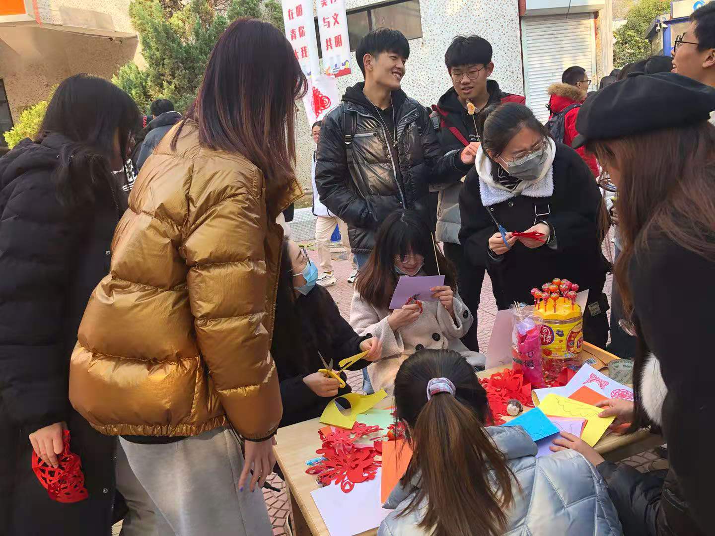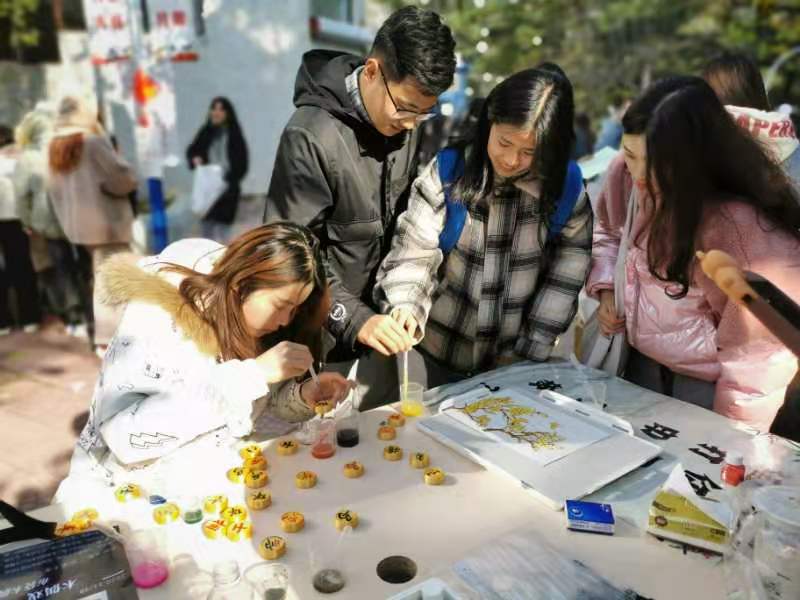 经过半个月的精心准备,非遗宣传展示活动在期盼中顺利召开。活动内容丰富多彩,包括儿时最爱的糖葫芦,能让我们放飞梦想的风筝,长辈们最熟悉的剪纸,民俗活动中必备的花灯和灯谜,色彩鲜艳的扎染,孩子爱玩的泥塑,人气火爆的中国结,搞怪多趣的脸谱,结合现代3D打印技术的景泰蓝,剧情跌宕起伏的皮影戏和木偶戏,饱含淑女情怀的绒花制作以及文雅诗意的篆刻等13种非遗活动。同学们分成了一个个“小摊位”,不仅展示了提前制作好的非遗作品,而且在现场教观众门体验制作过程。