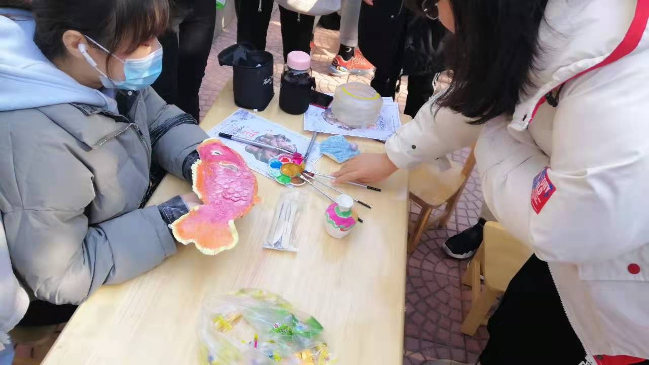 在制作风筝的现场,同学们可以先用精湛的绘画技艺在空白纸上创作喜欢的图案,写上自己的祝福,再用简单的原材料组装起来一个简易的小风筝,然后就可以去试试放飞啦。