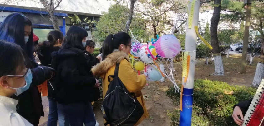 这是花灯展示和猜迷现场。同学们在花灯制作过程中,将传统梅兰竹菊等纹样加入了其中,使花灯极具欣赏性。同时,还准备了150道灯谜。答对的观众可以获得糖果或者一盏小花灯,吸引观众们纷纷前来一测脑力。一位退休的老师和一位文学院的女同学均猜对了5道灯谜,并列榜首。