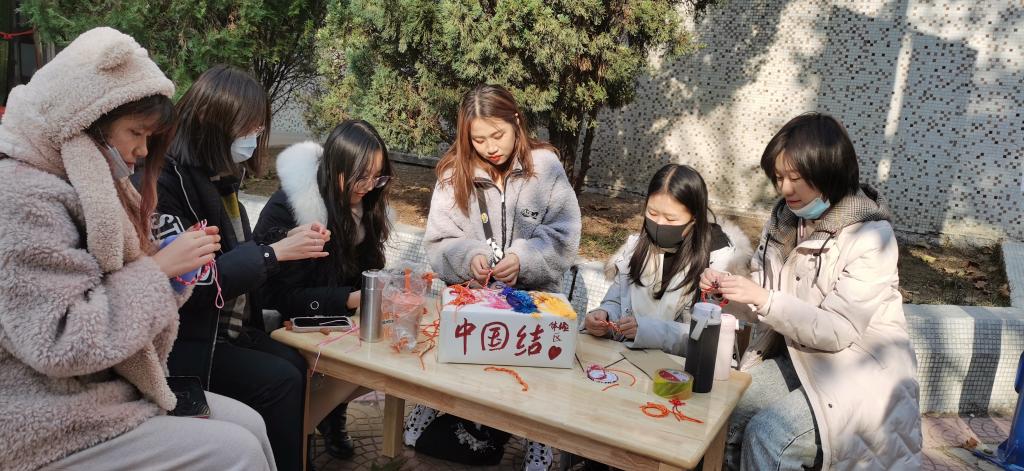 在中国结的制作现场,同学以一对一或者一对二的形式来教授观众,包教包会。制作的平结、绳结等都可以直接带走,留作纪念。