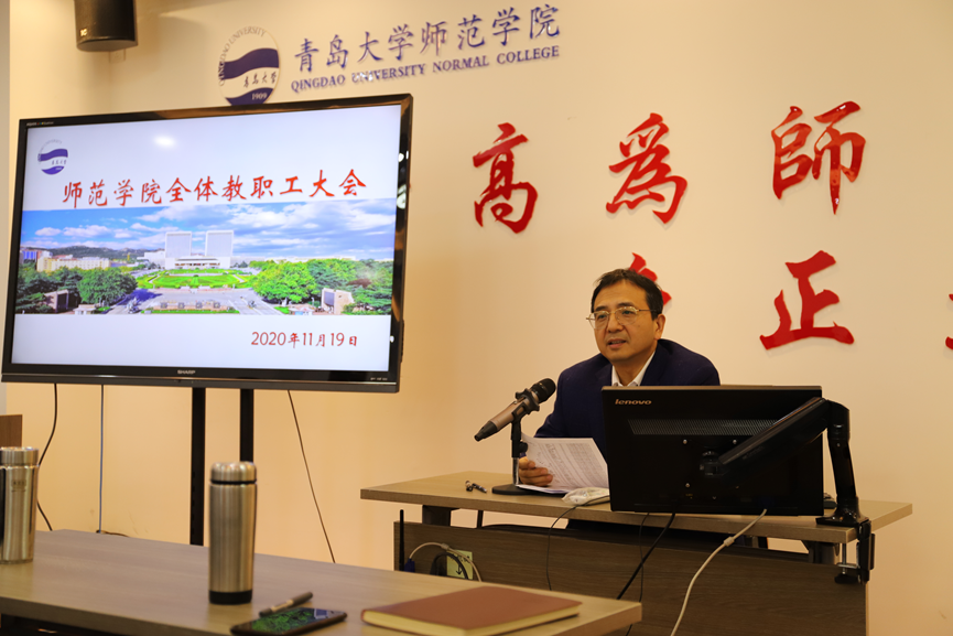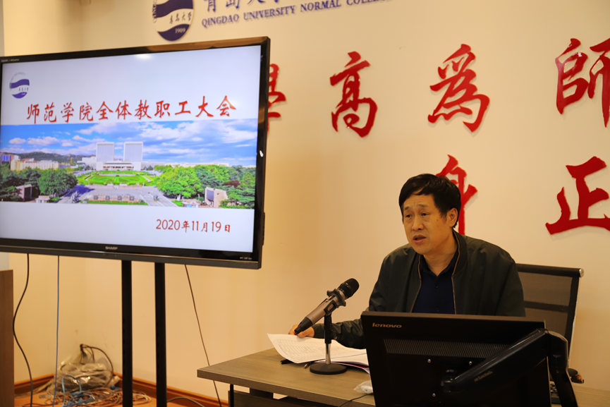 11月19日,师范学院在德润楼201会议室召开全院教职工大会,对前期工作进行总结,对今后工作重点做动员和部署。会议由院党委书记宋贵欣主持。
