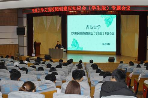 11月6日,工口 在北院报告厅开展《文明校园创建应知应会(学生版)》专题会议。本次活动由院学工办主任赵炜主持,2019级全体学生参加。