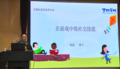 4月8日上午。胡磊博士毕业于加拿大曼尼托巴大学(University of Manitoba)心理系应用行为分析学专业,现任青岛梦翔学校执行校长,负责指导青岛市孤独症实验班ABA领域的工作。胡磊博士通过分享大量的视频和案例,生动形象地展示了自闭症儿童的各种社交障碍及其克服方法,提出社交能力是自闭症康复面临的主要障碍之一、而游戏治疗可以有效的改善和提高自闭症儿童社交能力,并系统讲解了社交的不同分类和演示了多种游戏治疗方法。