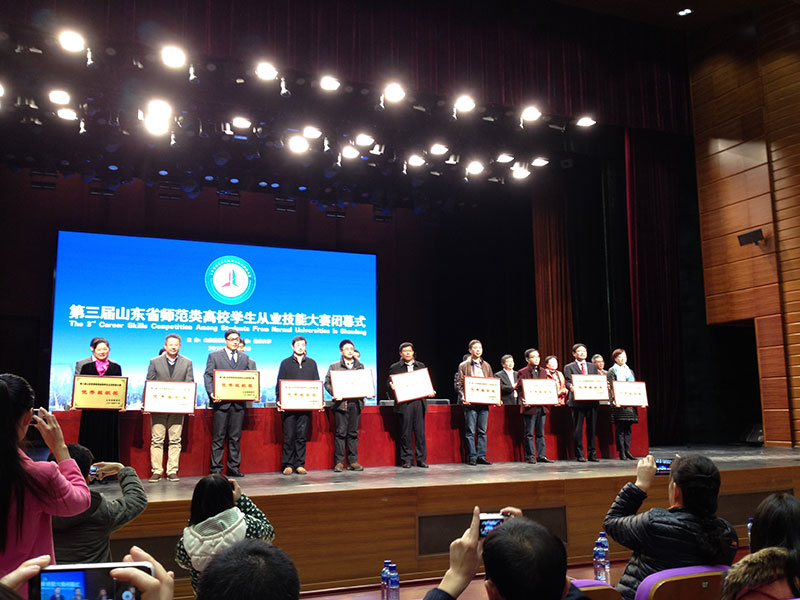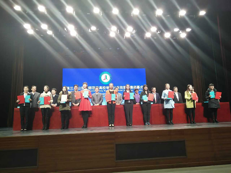 11月22日,第三届山东省师范类高校学生从业技能大赛决赛在烟台落下帷幕。由工口 学子组成的工口 代表队共13位选手参赛,经过2天激烈角逐,最终取得优异成绩。赵甜甜、张珺、于娟、陈宇嘉、周晓倩等5位同学分获高中化学、初中数学、小学数学、小学英语、高中物理组一等奖,其中赵甜甜、张珺、于娟3位同学成绩位列同组全省第一名,王倩、杨慧娟、严文海、庞晖、姜静等5位指导老师获优秀辅导教师奖,工口 获优秀组织奖。