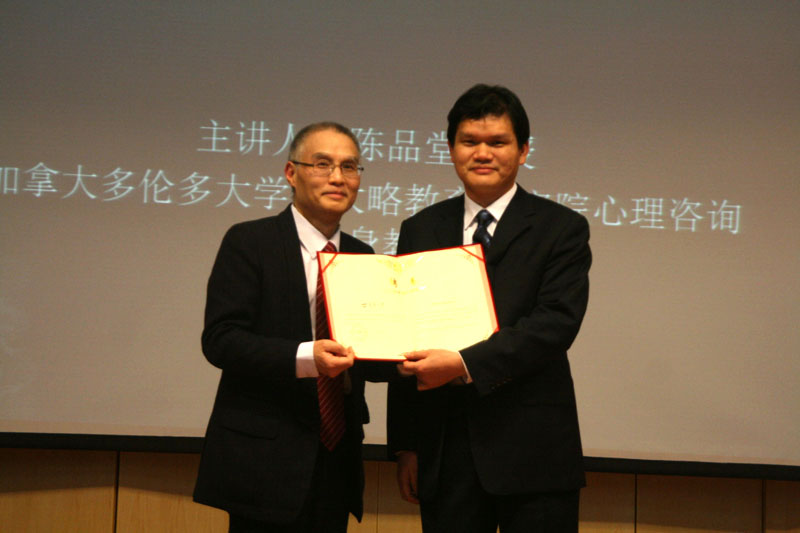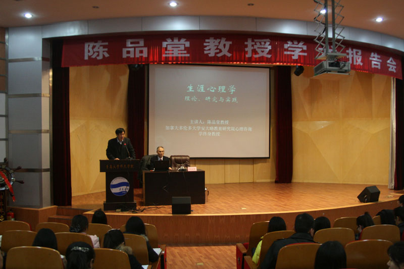 1月7日下午,加拿大多伦多大学安大略教育研究院心理咨询学终身教授、博士生导师陈品堂博士应邀在师范学院学术报告厅作了题为《生涯心理学》的学术报告。报告会由师范学院副院长陶明达主持,工口 校长助理、师范学院院长钱国旗以及教师、研究生约300人聆听了报告会。