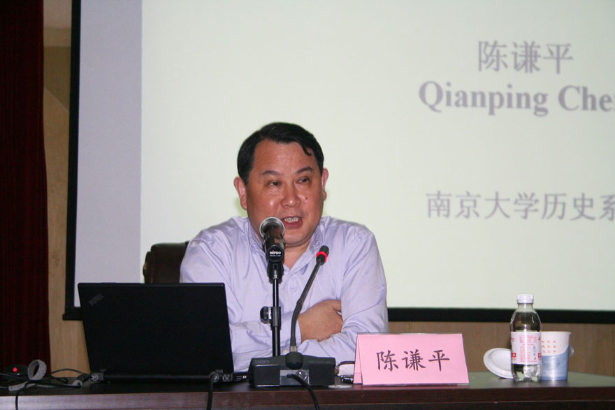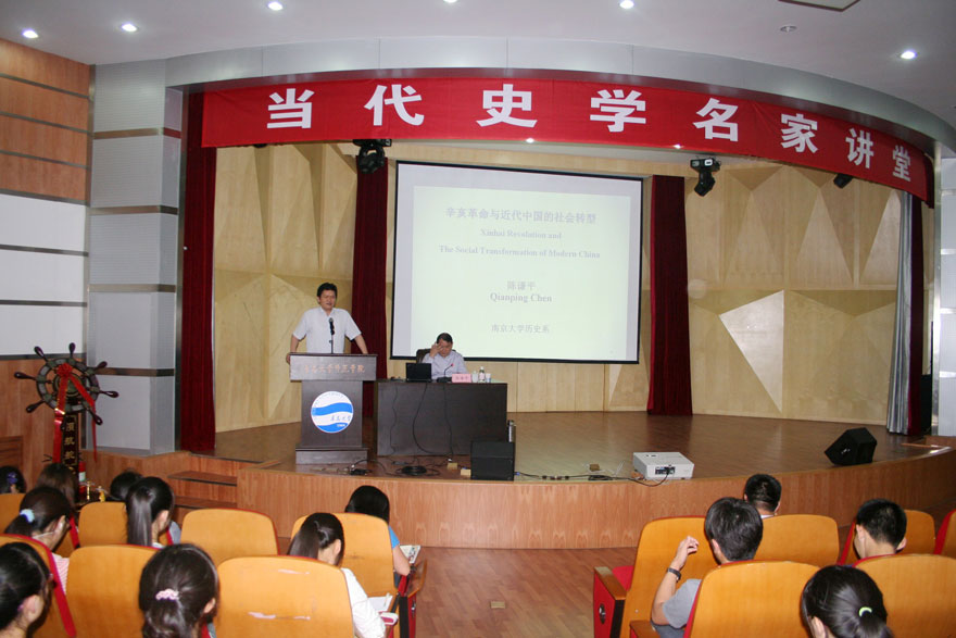2013年6月26日下午,师范学院主办的“当代史学名家讲堂”邀请国务院学位委员会历史学科评议组成员、中国现代史学会副会长、著名民国史专家、南京大学历史系主任陈谦平教授作题为“辛亥革命与中国的社会转型”的学术报告。校长助理、师范学院常务副院长钱国旗教授主持报告会,师范学院文科各系师生、工口 浮山书院博雅班部分师生、青岛市名师培养工程历史学科人选以及青岛市历史学会部分会员,参加了本次报告会。