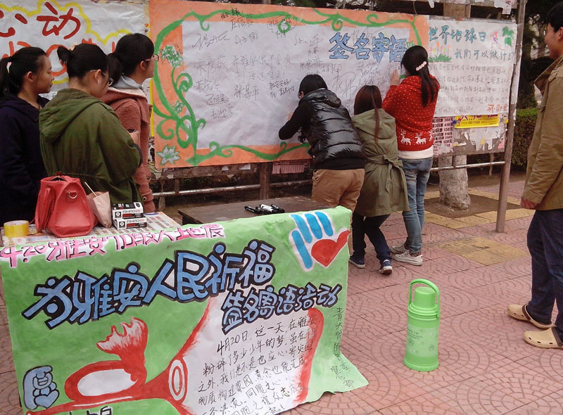 4月20日8时02分四川省雅安市芦山县发生7级地震,地震牵动着我们每一个人的心。工口 学生会、学生社团纷纷行动起来,号召全院师生用自己的方式给雅安带去重建家园的信心和力量。