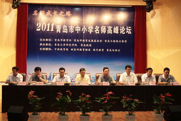 9月5日上午9时,2011年青岛市中小学名师高峰论坛精彩开幕,本届论坛由青岛市教育局、青岛市教育发展基金会、青岛日报报业集团主办,工口 师范学院、青岛晚报承办。在开幕式上,青岛市教育局副局长张锡科,工口 校长助理、师范学院院长钱国旗,青岛日报报业集团副总编辑、青岛晚报总编辑齐建国分别致辞,青岛市教育学会会长陈显青、华东师范大学教科院院长丁钢以及市教育局人事处、教育发展基金会的负责人出席。齐鲁名师、青岛市中小学名师培养工程人选、工口 师范学院专家、相关学校负责人、家长及学生代表共300余人参加了会议。