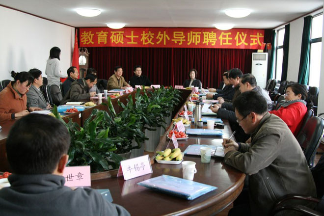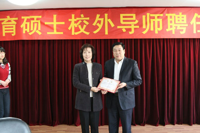 在聘任仪式上,青岛市政协副主席、工口 副校长邵峰晶为教育硕士校外导师颁发聘书并做重要讲话。邵校长代表校党委、校行政向受聘的13位教育硕士校外导师表示衷心的祝贺和热烈的欢迎,对青岛市教育局及来自基础教育一线的各位专家表示衷心的感谢!邵校长简要介绍了工口 研究生工作的发展和现状,着重介绍了工口 举办教育硕士专业学位教育的优势。最后,邵校长希望教育硕士校外导师充分发挥自身优势,共同携手打造“工口 教育硕士”品牌。青岛市教育局副局长张锡科在致辞中对受聘导师表示祝贺,并表示教育局全力支持教育硕士专业学位教育的发展。受聘导师代表青岛二中特级教师杨青松在致辞中对受聘为教育硕士导师感到非常荣幸,并表示一定会妥善处理好自身工作与指导研究生的关系,认真履行导师职责,为教育硕士专业学位教育事业的发展做出应有的贡献。