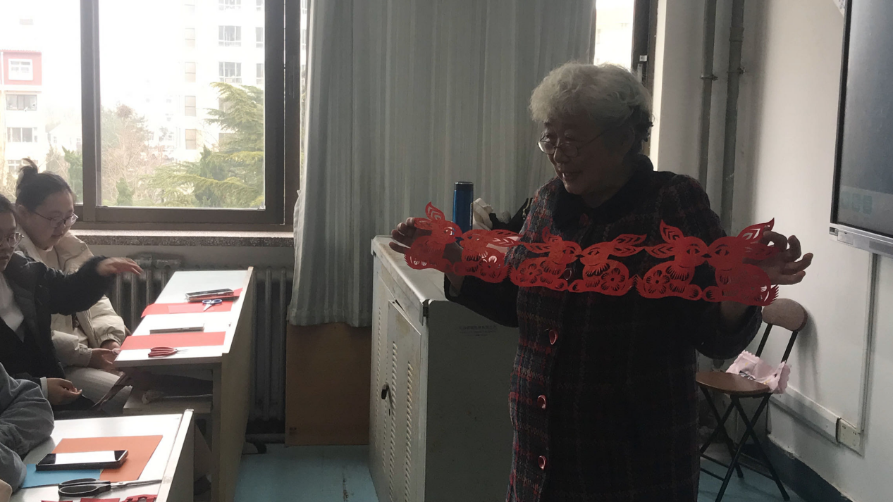 李文玲老师结合自己六十多年祖传的剪纸技艺,以及年轻时做幼儿教师的经历,一边讲着引人入胜的小故事,一边操纵着剪刀灵活地穿梭在纸间。短短几分钟,一排小兔子跃然纸上,活灵活现。面对同学们抑制不住流露的赞叹与惊奇,她神秘一笑,告诉同学们成功的秘诀——练。千变万化的形态,举手投足的自如,无需“打样儿”的熟练,背后都离不开长年累月的锤炼。