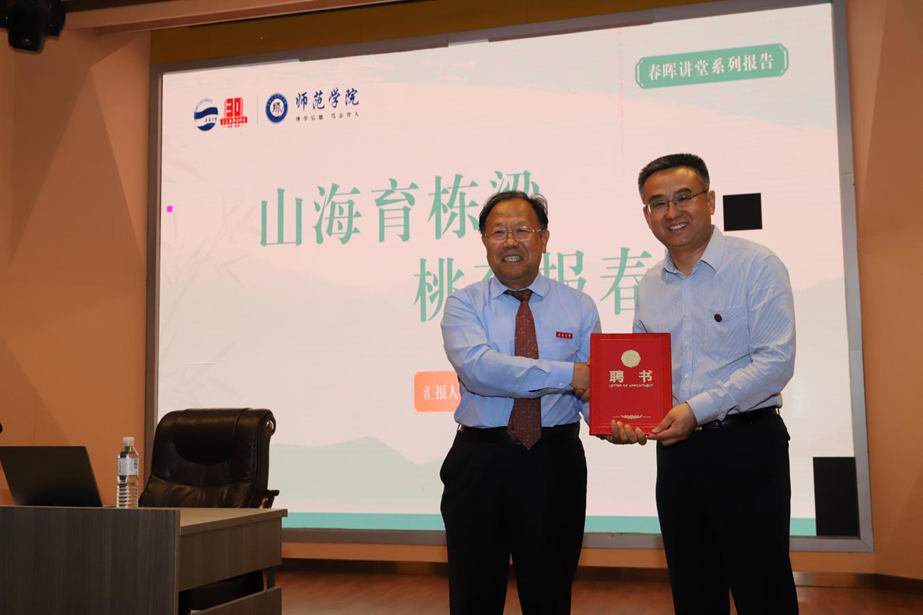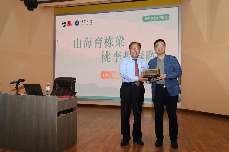 报告会之前,尹增刚为张述仁颁发了“师范学院创新创业导师”聘书,马勇军向张述仁赠送了学院文创产品印章套装。