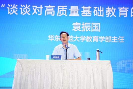 启动仪式后,华东师范大学教育学部主任袁振国教授做了题为“谈谈对高质量基础教育的理解”的学术报告。袁教授从广度、高度和深度三方面解读了新时代高质量基础教育的内涵。袁教授认为高质量基础教育应从传统的认知能力的培养向非认知能力培养,应由一般素养向核心素养转变,着重培养学生的社会情感能力。他指出,信息技术拓宽了基础教育高质量发展的边界,未来有望实现人工智能与教育的深度融合,推动个体个性化、创造性学习。袁教授讲座观点新颖,视野宏阔,引起了老师们的强烈共鸣。互动环节,老师们积极提问,现场气氛十分热烈。