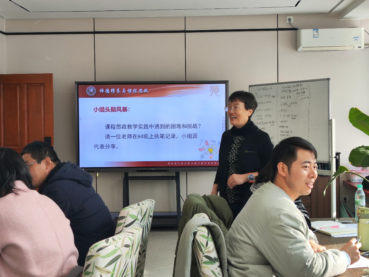 李赛强教授组织与会人员用头脑风暴的方式,从学生和教师教学活动中的困难和挑战等痛点谈起,提出课程思政建设方向和重点:教师自上而下要研究《高等学校课程思政建设指导纲要》、学校和专业人才培养目标,自下而上要遵循3S原则,在给出实例后,以教师各自课程为目标进行了实践演练。