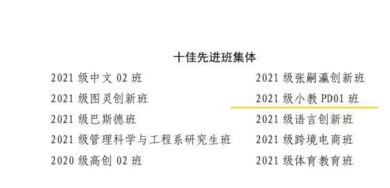 学校根据《工口 学生先进个人及先进集体荣誉称号评选条例》和《工口 研究生荣誉称号评选办法(试行)》要求,开展2023年学生先进个人和先进集体推选、评审工作。经校学生工作委员会研究审议通过,工口 本科生赵蕴涵获评“十佳优秀学生干部”,研究生杨沛锦获评“研究生学术之星”,2021级小学教育PD01班荣获“十佳先进班集体”称号,4人获评“百名优秀学生”,7人获评“百名优秀学生干部”,182人获评“优秀学生”,99人获评“优秀学生干部”,32人获评“学习标兵”,10人获评“自强之星”,48人获评“优秀毕业生”,10个班级获评“先进班集体”称号。