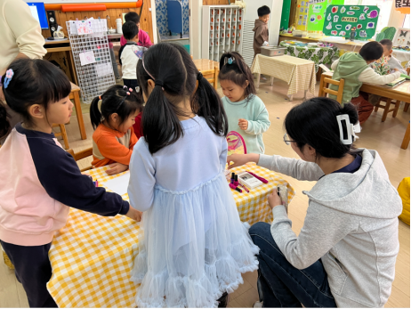 随后,同学们按小组进入不同年龄段的班级,重点观察观察大、中、小班游戏是如何计划、开展、结束和分享的,同时对角色区、建构区的材料进行登记、统计,记录大体数量并分析其类型。同学们发现幼儿园中的建构游戏材料丰富多样,每班投放的角色游戏材料各不相同。小组成员纷纷用照片和视频的形式记录下此次宝贵的经历。