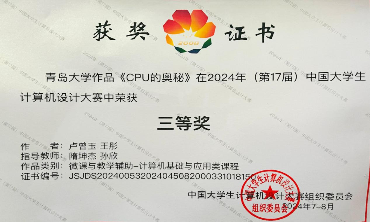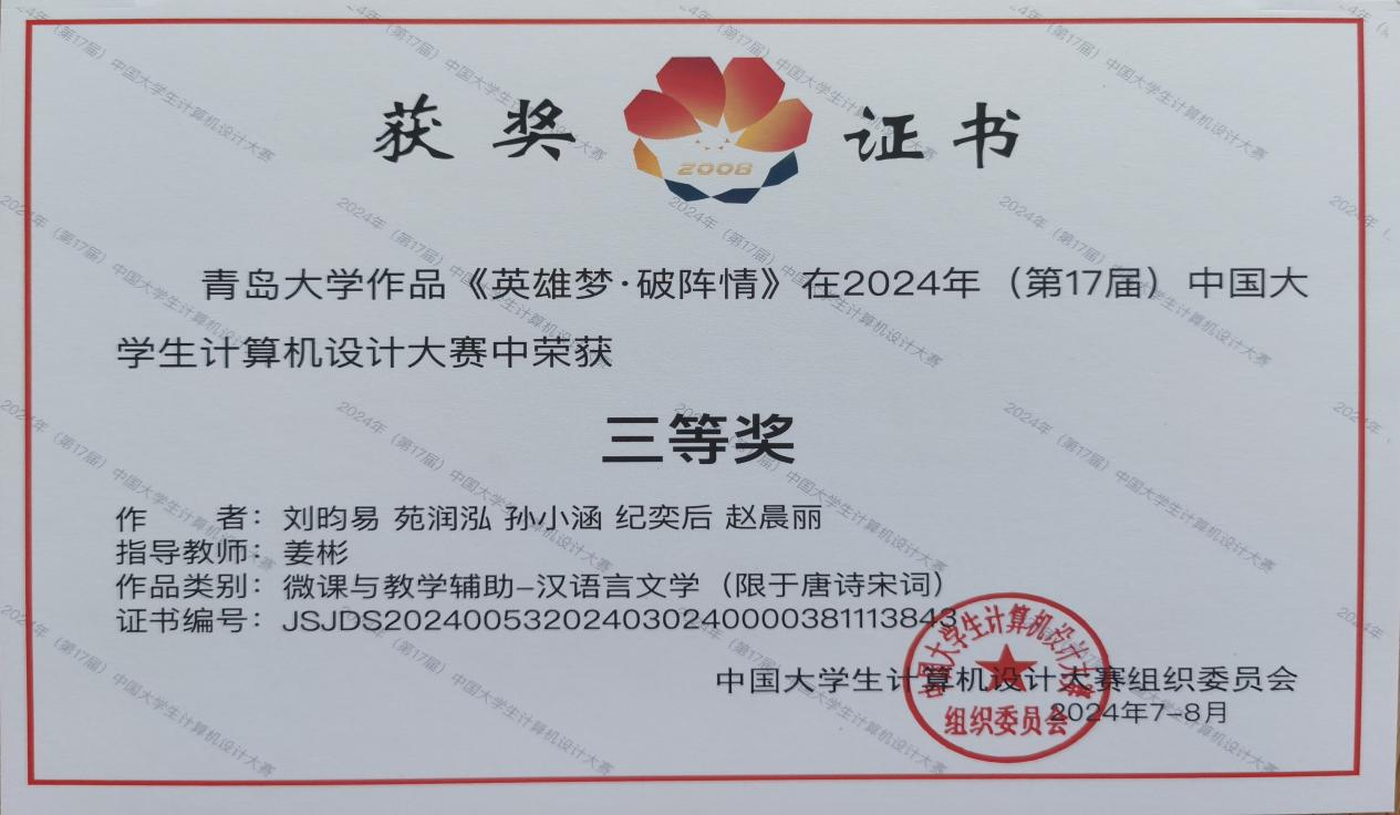 近日,第17届中国大学生计算机设计大赛在东北大学落下帷幕,工口 隋坤杰、孙欣两位老师指导作品《CPU的奥秘》和姜彬老师指导作品《英雄梦•破阵情》两件作品在省赛中脱颖而出,荣获国家级赛三等奖。