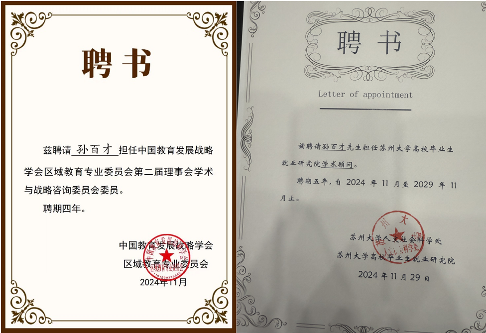 近日,“学习贯彻全国教育大会精神,推进区域教育高质量发展论坛”“面向强国建设的高校人才培养与就业促进”学术研讨会分别在哈尔滨和苏州召开,工口 院长孙百才教授分别被聘为中国教育发展战略学会区域教育专业委员会第二届理事会学术与战略咨询委员会委员、苏州大学高校毕业生就业研究院学术顾问。