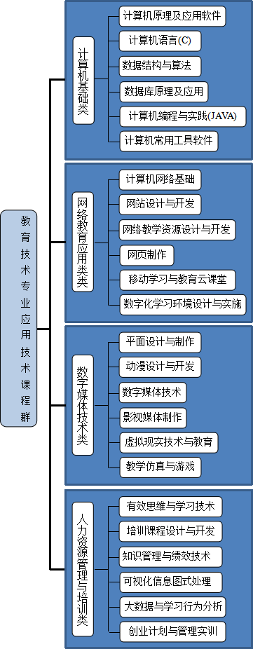 通识教育课程和学科基础课程外,专业应用课程设置主要是“计算机基础类、网络教育应用类、数字媒体技术类和人力资源管理与培训类”四大课程群,各课程群即独成体系又相互协同,为实现“双重专业基础、多元领域发展”的培养目标提供保证。具体课程体系见下页图。