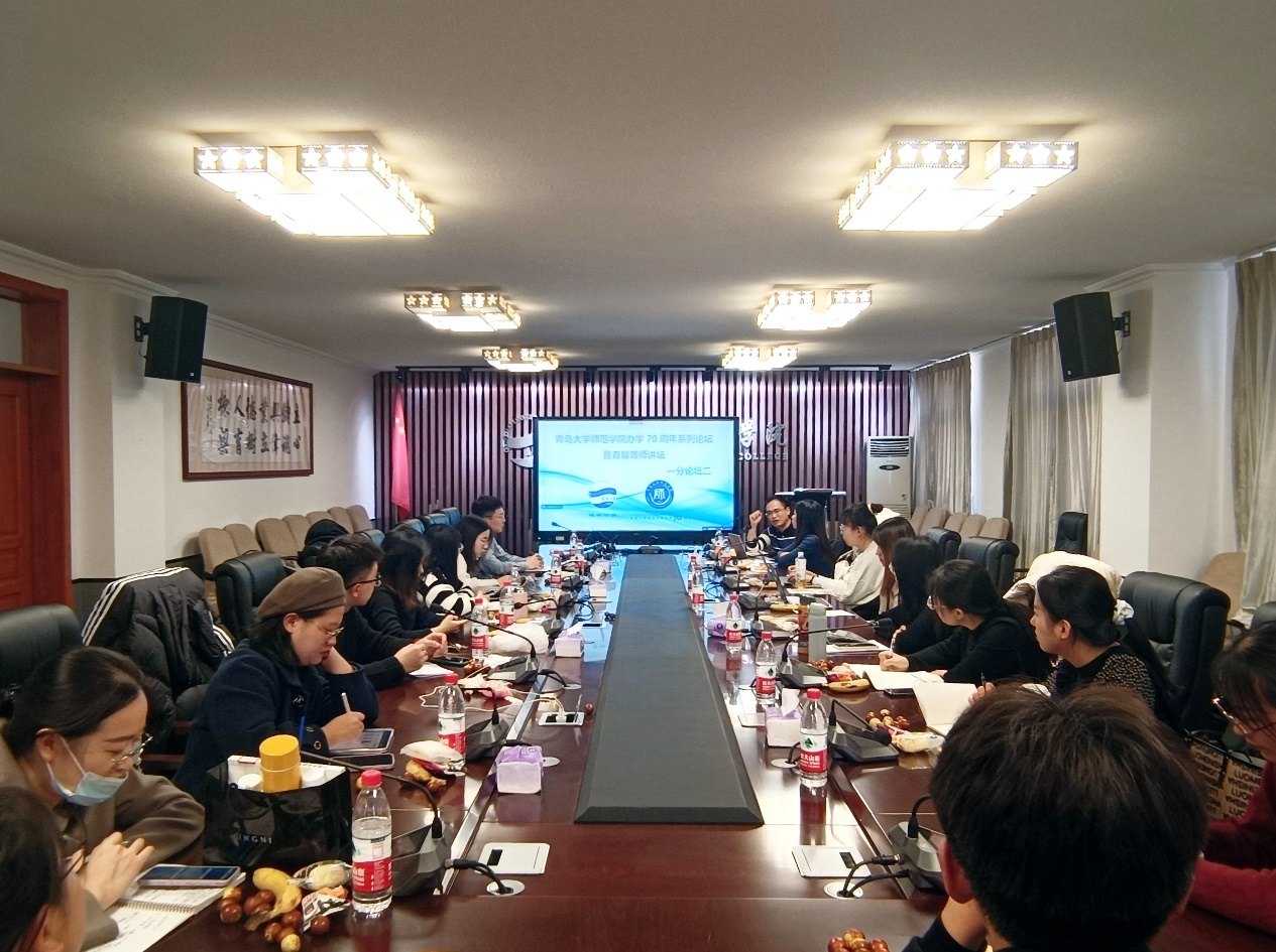 12月4日上午,师范学院在德润楼举办办学70周年系列论坛暨首届菁师讲坛。本次论坛以线上线下相结合的方式展开,共设主论坛一个、分论坛三个。主论坛特邀烟台理工学院副校长、国家二级教授、鲁东大学博士生导师苏春景教授作主题报告,副院长马勇军主持论坛,副院长陶明达、院长助理张克顺、相关学科教师以及全体研究生参加此次论坛。
