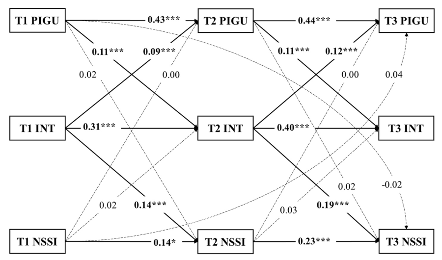 图1.交叉滞后面板模型(CLPM)结果。为简洁起见。虚线表示路径不显著,实线表示路径显著。PIGU = 问题性网络游戏使用;INT = 内化症状;NSSI = 非自杀性自伤。*p < 0.05;**p < 0.01;***p < 0.001