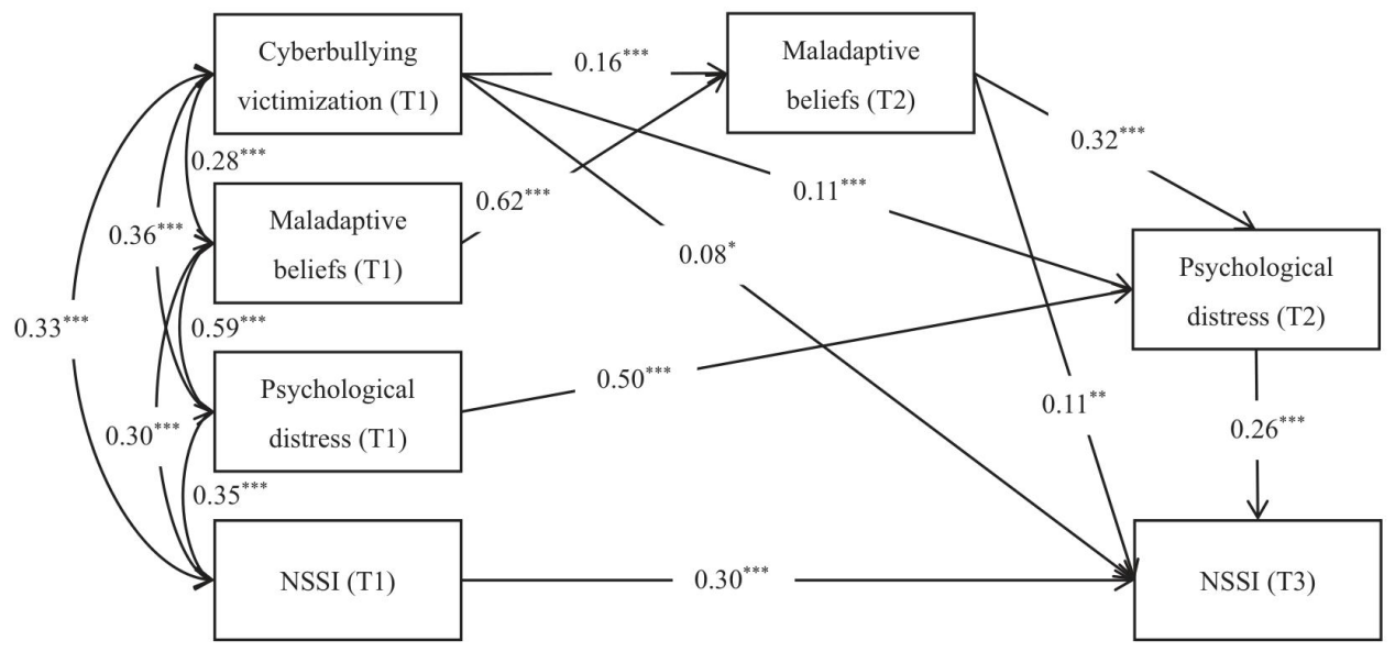 通过结构方程模型(SEM)分析,研究显示:网络欺凌受害直接预测非自杀性自伤行为,其影响还通过青少年的非适应性认知与心理痛苦间接发生;值得注意的是,网络欺凌受害对非自杀性自伤行为的影响既通过青少年的非适应性认知和心理痛苦的平行中介发生作用,也通过青少年的非适应性认知和心理痛苦的链式中介发生作用。