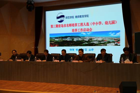 11月24日下午,“青岛市第三期普通中小学幼儿园名师名师名园长培养工程”启动仪式暨首期集中研修在工口 学术报告厅举行。工口 党委副书记杜方波,青岛市教育局副巡视员姜林,教育局人事处(教师教育处)副调研员张文学,师范学院党委书记宋贵欣、院长李福华、副院长陶明达、马勇军等领导共同出席了启动仪式。启动仪式由李福华主持,首届“岛城名师”代表、第三期全体名师名园长工程人选,各区市教体局及青岛市教育局属单位相关领导,师范学院/教师教育学院相关职能部门负责人、各教学系主任、教师及在校研究生和本科生代表参加了会议。