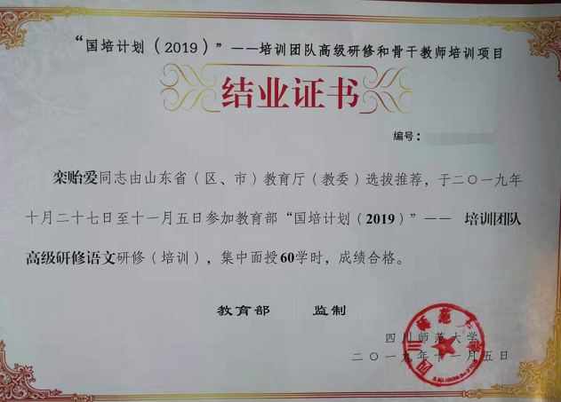 近日,由工口 推荐并给予经费支持的语文教育专业课程教学论任课教师栾贻爱赴四川师范大学参加“国培计划”(2019)——培训团队高级研修语文(高校或教师培训机构)项目培训,并在完成相关课程学习后顺利取得结业证书。